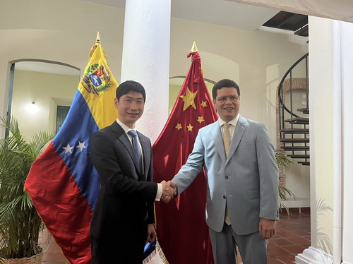 2023年6月9日,驻委内瑞拉大使蓝虎会见瓦伦西亚市市长富恩马约尔,双方共同出席瓦伦西亚市政府举办的“中国龙和太阳女神”主题环保画展开幕式。