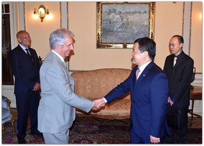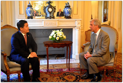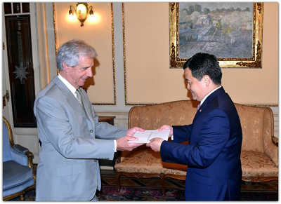 2015年12月30日,新任中国驻乌拉圭大使董晓军在乌总统官邸向巴斯克斯总统递交国书。