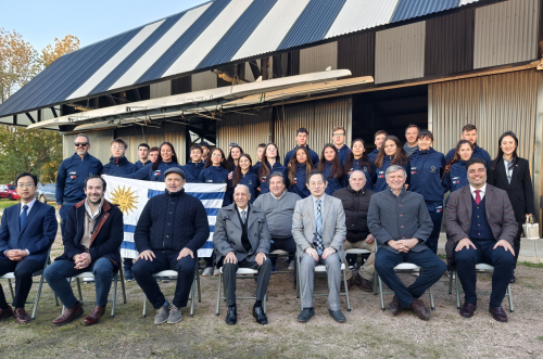 2024年5月13日,驻乌拉圭大使黄亚中出席中乌第二期体育教练技术援助项目乌拉圭赛艇队运动员赴华欢送仪式,乌国家体育秘书局局长包萨、乌奥委会主席马戈利奥内出席活动。
