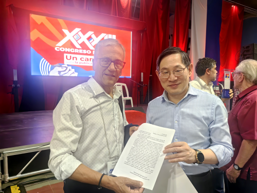 2025年12月12日,驻乌拉圭大使黄亚中应邀出席乌共产党第33次代表大会开幕式,并同出席大会开幕式的乌副总统、国会主席兼参议长高斯、执政党广泛阵线主席佩雷拉及乌劳工部长、乌共总书记卡斯蒂略等热情寒暄。