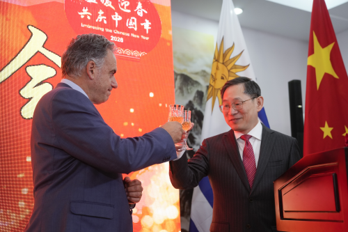 2026年2月12日,驻乌拉圭使馆隆重举办“温暖迎春·共庆中国年”春节招待会,驻乌拉圭大使黄亚中致辞,乌总统奥尔西、外长卢贝特金、部分参众议员、在乌华侨华人、中企代表、汉语教师及乌各界友人300余人出席。