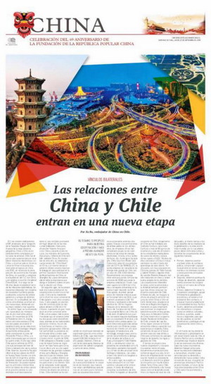 2018年9月27日,驻智利使馆在当地最大纸媒《信使报》出版庆祝建国69周年和改革开放40周年特刊。驻智利大使徐步发表题为《中智关系进入新阶段》署名文章,全文如下: