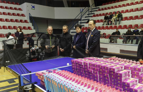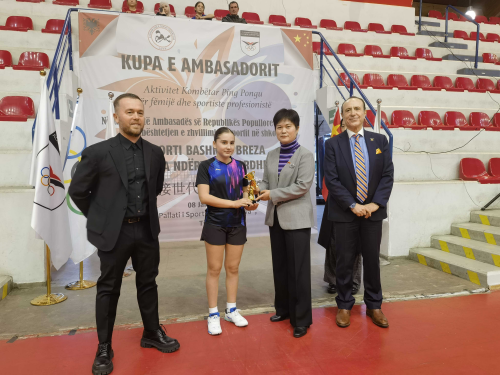2026年1月8日,驻阿尔巴尼亚大使庞春雪出席中国乒乓球器材捐赠仪式暨第一届阿尔巴尼亚“大使杯”乒乓球友谊赛。阿奥委会主席于利、乒协主席迪拉和运动员代表等近百人参加活动。