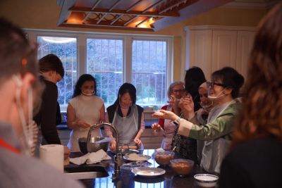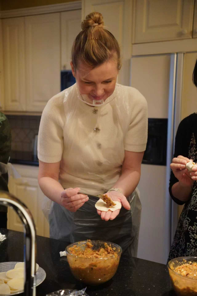 用擀面杖把切好的面团擀薄、将馅料放入饺子皮中心、再对折封边捏褶,大家聚精会神地学习着每一步操作。当把光滑的面团和擀面杖交到大家手中时,原本嘈杂的屋子瞬间安静下来,每个人都像对待精细实验一样,神情专注,努力用最漂亮的饺子迎接中国新年。