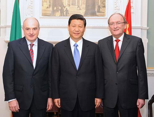 习近平转达了吴邦国委员长的亲切问候和良好祝愿,表示这次到访爱尔兰,是为进一步加深两国传统友好,加强务实合作,推动两国关系向更高水平迈进而来。中爱两国人民长期友好,相互尊重,双方都有着重视教育和农业、人民勤劳智慧等共同特点。2011年,中爱关系继续保持平稳发展势头。中国已连续5年成为爱尔兰在亚洲地区第一大贸易伙伴。双方在教育、文化等领域的交流与合作也不断扩大。中爱关系的发展表明,文化传统、幅员大小、社会制度等差异并非是中西方之间不可逾越的鸿沟,只要本着平等、互信、互利的精神,真诚相待,友好相处,双方就完全可以超越社会制度和意识形态差异,成为好朋友、好伙伴。我们珍惜同爱尔兰的友好关系,希望进一步深化两国各领域交流与合作,加深两国人民的了解和友谊。
