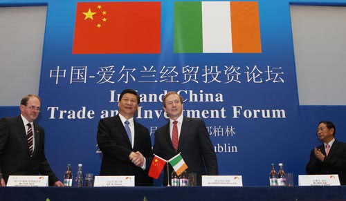 习近平说,当前中国正在积极实施2011年至2015年国民经济和社会发展第十二个五年规划纲要,国内市场规模、进口规模和对外投资规模都有很大增长,这将给包括爱尔兰在内的世界各国企业带来巨大商机。希望两国企业家抓住机遇,把深化经贸合作作为促进经济共同发展的着力点和两国关系新亮点。习近平就此提出五点建议: