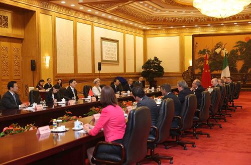 2013年5月14日,全国人大常委会委员长张德江在人民大会堂与爱尔兰议会众议院议长巴雷特、参议院议长伯克举行会谈。