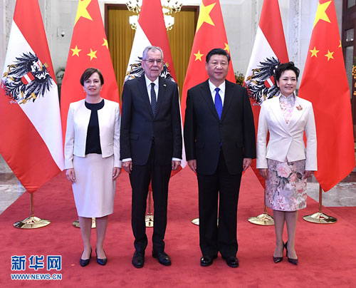 2018年4月8日,国家主席习近平在人民大会堂同奥地利总统范德贝伦举行会谈。两国元首一致决定,建立中奥友好战略伙伴关系,推动中奥务实合作迈上新台阶。奥地利总理库尔茨参加。