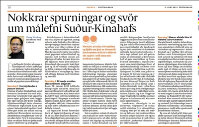 2016年6月3日,驻冰岛大使张卫东在当地主流冰文报纸《新闻报》发表署名文章,以问答形式介绍南海争端的根源,揭露南海仲裁案的非法性,阐释中国倡导通过谈判协商解决南海争议、维护南海和平、稳定、繁荣的立场,希望读者公正客观地理解和支持中国立场。
