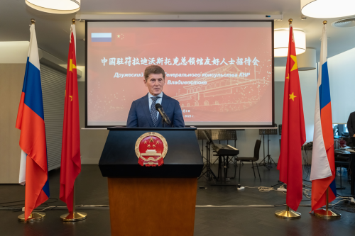 2023年4月3日,驻符拉迪沃斯托克总领馆举办领区友好人士招待会。驻符拉迪沃斯托克总领事朴扬帆出席,滨海边疆区州长科热缅科、立法会议主席罗利克、符拉迪沃斯托克市长舍斯塔科夫、俄罗斯外交部驻符拉迪沃斯托克市代表布洛瓦列茨、科学院远东分院院长库里钦、滨海边疆区对华友协主席拉林、记者联盟滨海分部主席苏哈诺夫等应邀参加并致辞。滨海边疆区政府主席谢尔比娜、符拉迪沃斯托克市杜马主席布里克、萨哈林州经济发展厅副厅长布图汉诺夫等领区友好人士,中资机构、华侨华人和留学生代表,以及有关国家外交领事机构官员等260余人参加。