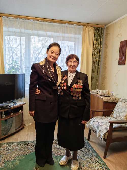 2023年10月31日,驻符拉迪沃斯托克总领事朴扬帆看望曾在中国东北参加对日作战的涅戈达老人。