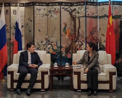2023年11月15日,驻符拉迪沃斯托克总领事朴扬帆会见黑龙江省牡丹江市委副书记、穆棱市委书记贺业方。