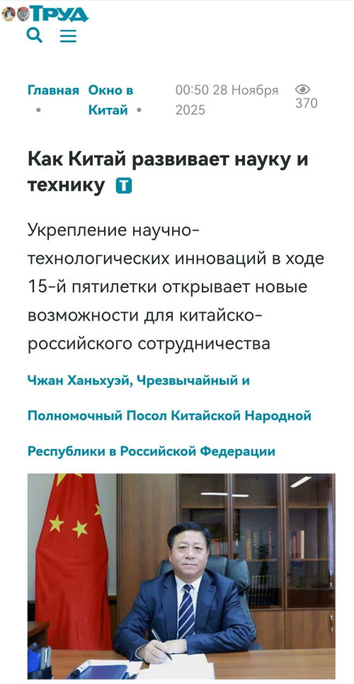 2025年11月28日,驻俄罗斯大使张汉晖在《劳动报》发表署名文章《迈向高水平科技自立自强:中国科技创新征程与中俄科技合作新机遇》。全文如下。