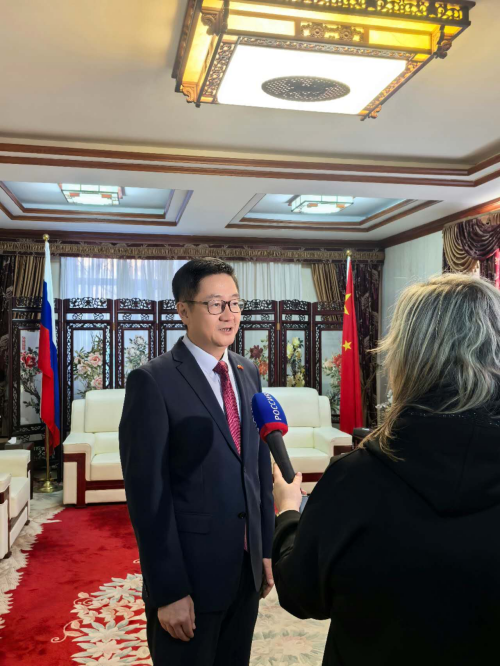 2025年12月2日,驻哈巴罗夫斯克总领事姜笑洋就俄方对中国公民实施免签政策接受俄罗斯国家电视台记者采访。