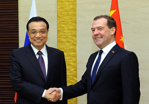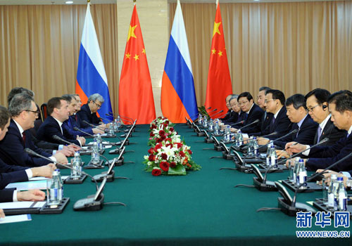 梅德韦杰夫表示,李克强总理不久前成功访俄,有力推动了俄中关系发展。双方的重点合作项目正在稳步推进。俄方愿进一步加强两国在油气、核能、水电、金融、科技创新、航空制造、航天等领域及俄罗斯远东地区的合作。俄方愿同中方加强在上合组织框架内的合作,维护地区的和平、稳定与发展。