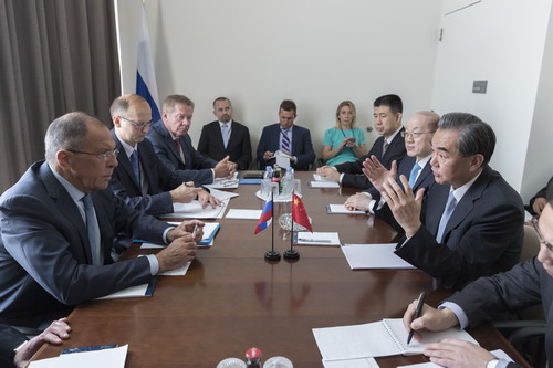 当地时间2017年9月18日,外交部长王毅在纽约出席联合国大会期间会见俄罗斯外长拉夫罗夫。