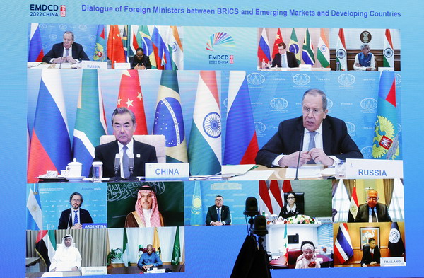 2022年5月19日晚,国务委员兼外长王毅在北京主持金砖国家同新兴市场和发展中国家外长视频对话会。南非外长潘多尔、巴西外长弗兰萨、俄罗斯外长拉夫罗夫、印度外长苏杰生等金砖国家外长和哈萨克斯坦副总理兼外长特列乌别尔季、沙特阿拉伯外交大臣费萨尔、阿根廷外长卡菲耶罗、埃及外长舒克里、印尼外长蕾特诺、尼日利亚外长奥尼亚马、塞内加尔外长艾莎塔、阿联酋国务部长萨耶赫、泰国副总理兼外长代表等嘉宾国部长与会。