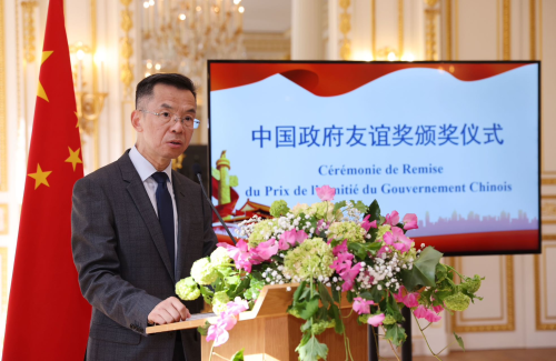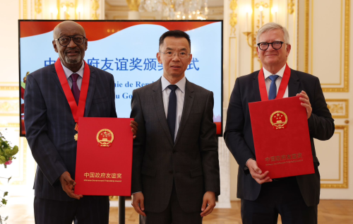 2023年4月19日,驻法国使馆隆重举行2022年度中国政府友谊奖颁奖仪式。驻法国大使卢沙野向联合国教科文组织原副总干事、清华大学中国—非洲领导力发展中心联席主席格塔丘·恩吉达和法国蓝星安迪苏公司首席执行官、动物营养学专家让-马克·杜布朗颁发奖章和证书。清华大学王宏伟副校长、蓝星(集团)郝志刚董事长、获奖者亲属及同事,法国科技、教育机构代表及使馆主要外交官等共约50人出席颁奖仪式。