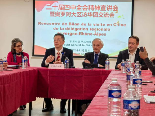 2025年11月25日,驻里昂总领馆举办中共二十届四中全会精神宣讲会暨奥罗阿大区政经文教各界访华交流会。驻里昂总领事于江,奥罗阿大区议会亚洲事务主管李安娜、新中法大学协会副主席拉巴特、里昂三大副校长约贝尔及来自里昂工商会、中国银行里昂分行、里昂机场集团、法国利马格兰集团等以及侨界、学联代表出席。