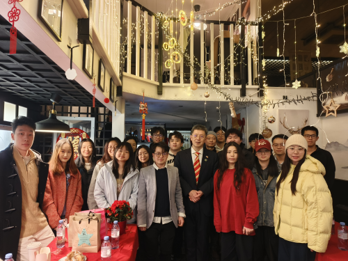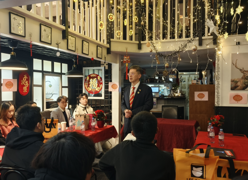 于总领事介绍习近平主席的新年贺词,并向同学们致以新春问候,勉励大家珍惜留学机会,努力增长本领,将实现自身价值与中华民族伟大复兴结合起来,胸怀祖国,放眼世界。