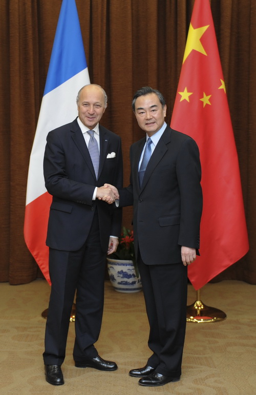 2013年4月12日,外交部长王毅与来访的法国外长法比尤斯举行会谈。