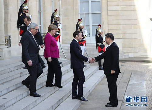当地时间2019年3月26日,国家主席习近平在巴黎同出席中法全球治理论坛闭幕式的法国总统马克龙、德国总理默克尔和欧盟委员会主席容克举行会晤。