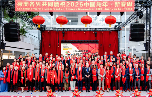 2026年2月14日,驻荷兰大使申博出席在海牙市政厅举办的2026年荷兰各界庆祝马年新春活动。海牙市长范扎能及荷外交部官员、各国驻荷使节及侨界代表等近千人出席。