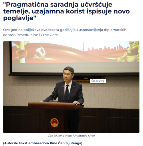 驻黑山大使陈绪峰在黑媒体发表《务实合作筑根基 互利共赢谱新篇》署名文章