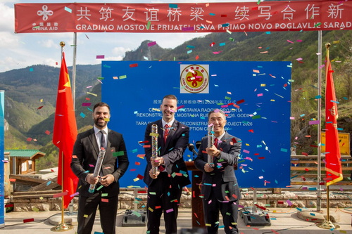 2026年4月20日,中国援助黑山塔拉河大桥修复项目复工仪式在扎布利亚克举行。驻黑山大使陈绪峰、黑山总理斯帕伊奇、海事部长兼交通部协调员拉杜洛维奇出席。
