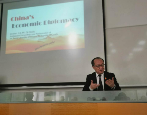 2023年11月23日,驻克罗地亚大使齐前进应邀为萨格勒布大学经济管理学院师生作中国经济外交专题讲座。克央行行长武伊契奇参加。