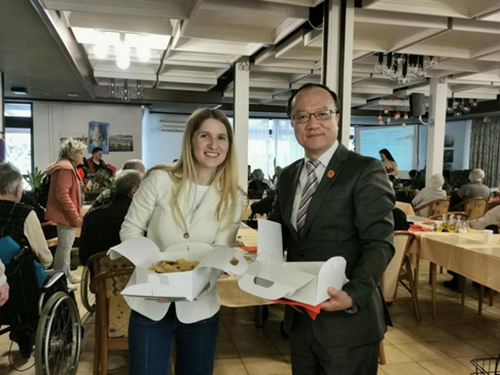 齐大使表示,国之交在于民相亲,中克两国都有尊老敬老的优良传统,照顾好老年人是全社会的共同责任,也是企业积极履行社会责任的体现。齐大使向养老院老人们赠送了使馆自制的中式传统点心,祝愿他们健康长寿。