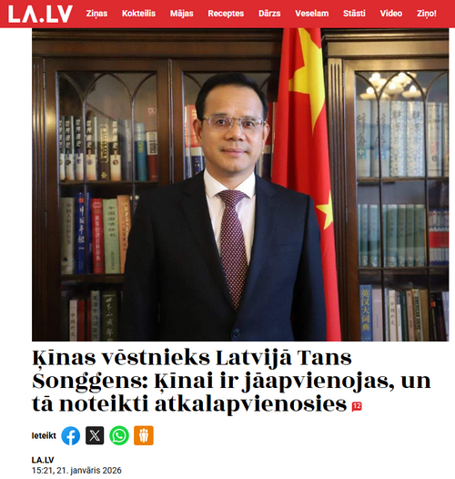 2026年1月21日,驻拉脱维亚大使唐松根在拉主流媒体《拉脱维亚报》发表署名文章《中国必须统一,也必然统一》,中文全文如下: