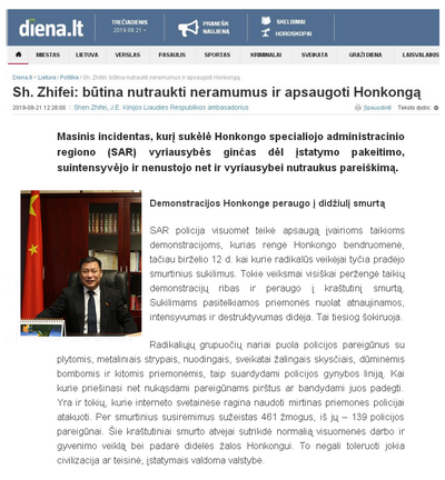 2019年8月21日,驻立陶宛大使申知非就涉港问题在立主流媒体立陶宛日报网发表题为《止暴制乱,守护香港》的署名文章。全文如下: