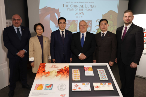 2026年2月9日,马耳他邮政总局在瓦莱塔邮政艺术博物馆举行“骏马传谊·非遗连心”——中国农历马年生肖邮票发行仪式。驻马耳他大使张佐、马邮政董事会主席赛德、马驻华大使白翰轩(北京分会场)等嘉宾出席并致辞。