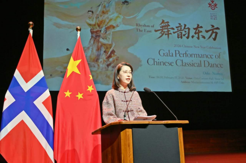 2026年2月13日,驻挪威使馆在奥斯陆举办“欢乐春节·舞韵东方”新春晚会。驻挪威大使侯悦,挪国防军司令克里斯托弗森、外交部秘书长拉尔森、中国煤矿文工团团长靳东及各界友人、驻挪使节、华侨华人、中资机构、留学生代表等1400余人出席。