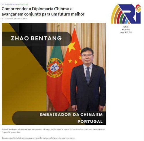 2024年1月15日,驻葡萄牙大使赵本堂在葡彩虹新闻网发表题为《理解中国特色大国外交,携手开创美好未来》的署名文章,宣介中央外事工作会议精神,全文如下: