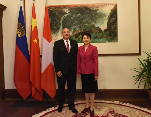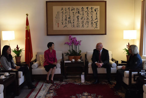 2016年11月24日,驻苏黎世兼驻列支敦士登公国总领事高燕平在总领馆会见列支敦士登公国政府委员兼社会部长佩德拉奇尼。