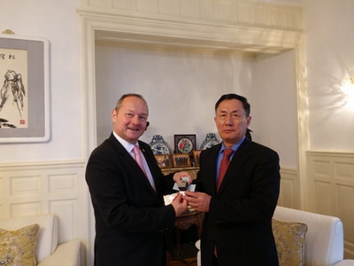 2017年4月19日,驻瑞士大使耿文兵在官邸会见瑞士联邦议会国民院议长约克·施塔尔和联邦院议长伊弗·比绍夫贝尔格。