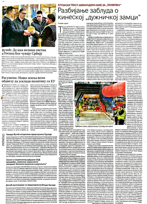 2025年12月20日,驻塞尔维亚大使李明在塞尔维亚《政治报》发表署名文章《破解“债务陷阱”迷思,弘扬合作共赢正道》,介绍“一带一路”倡议实践成就和世界意义,批驳所谓“债务陷阱”的虚假叙事,阐明中塞共建“一带一路”特别是资金融通的互利双赢本质,强调中塞务实合作为各国依托“一带一路”平台实现共赢树立了典范,中方愿同塞方一道,以构建新时代中塞命运共同体为引领,为动荡变革的世界注入更多稳定性、确定性、正能量。全文如下: