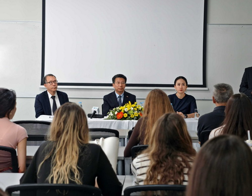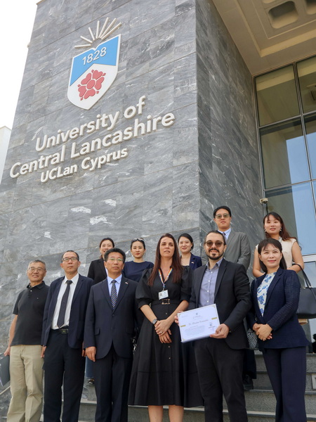 2025年11月5日,驻塞浦路斯大使刘彦涛率使馆青年外交官走进中央兰开夏大学塞浦路斯分校,宣介党的二十届四中全会精神,并与师生交流座谈。60余名师生参加。