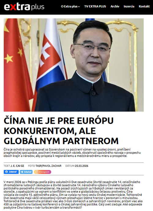 2026年3月25日,驻斯洛伐克大使蔡革在斯《特别报道+》杂志发表署名文章《中国不是欧盟的竞争者,而是全球性的伙伴》,全文如下: