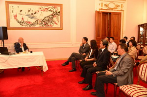 当日,杜伟大使还会见了来乌克兰举办“和平与友好”中乌艺术家绘画作品展的20位中国艺术家。中国著名画家、清华大学美术学院党委副书记郑艺教授为使馆外交官举办了题为“油画漫谈”的艺术讲座,向大家介绍了中国油画发展史、油画创作和鉴赏技巧,分享了艺术创作背后的典故趣事。使馆外交官积极参与本次活动并踊跃提问,与来访的艺术家们进行了现场互动交流。