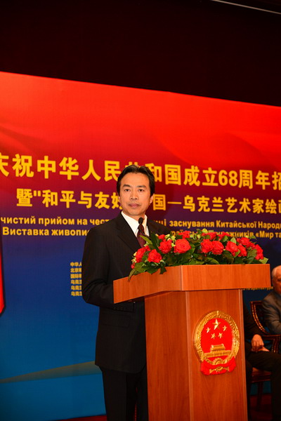 这次招待会还举办了“和平与友好”中乌艺术家绘画作品展,作为对中乌建交25周年和中国国庆68周年的一个献礼。我衷心希望,中乌各界人士携起手来,为中乌关系加油,为两国友好助力。
