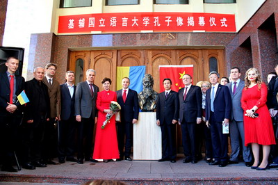 基辅国立语言大学校长瓦西科首先宣读乌克兰前总统克拉夫丘克致揭幕仪式的贺信。随后,杜伟大使与各主宾一起为孔子雕像揭幕,孔子学院院长史亚军带领孔院师生向孔子雕像行尊师礼。
