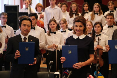 2017年10月26日,驻乌克兰大使杜伟、乌克兰第一夫人马琳娜•波罗申科共同出席丝绸之路和平奖基金会向基辅音乐学院捐赠小提琴仪式。基辅音乐学院院长兹洛特尼克主持活动。