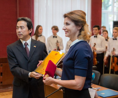 随后,杜伟大使还向波罗申科女士颁发了“丝绸之路人文合作奖”证书及奖章,表彰其近年来为推动中乌人文交流合作付出的努力。