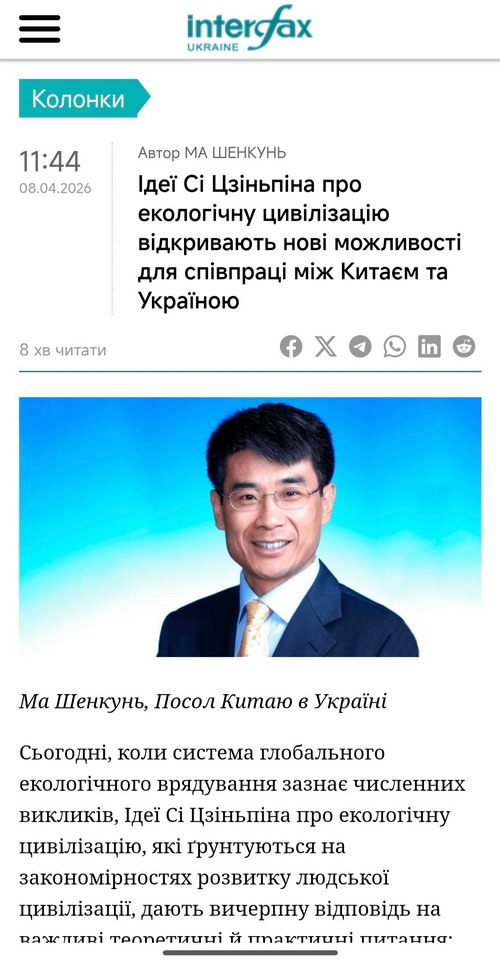 2026年4月8日,驻乌克兰大使马升琨分别在乌克兰国际文传电讯社(Інтерфакс-Україна)和乌克兰经济学人网(economistua)发表署名文章《习近平生态文明思想为中乌合作带来新机遇》。全文如下: