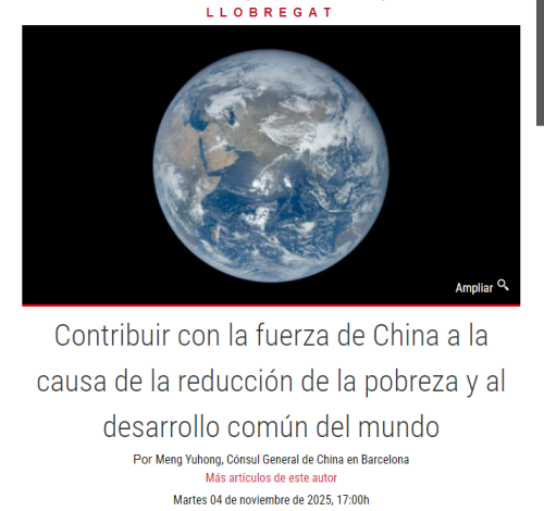 2025年11月4日,驻巴塞罗那总领事孟宇宏在西班牙《略夫雷加特报》发表署名文章《为人类减贫事业和全球共同发展贡献中国力量》,全文如下: