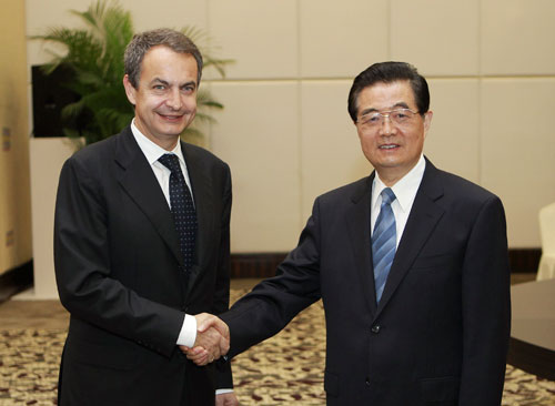 胡锦涛指出,西班牙是中国在欧洲的好朋友、好伙伴。近年来,双方高层交往频繁,各级别交流对话密切。双方始终理解和支持对方重大关切。通过共同应对国际金融危机,两国各领域务实合作取得新的显著进展。经贸关系从贸易往来向投资、技术、新兴产业延伸,电信、金融、可再生能源等成为新的合作亮点。双方人文交流成果丰硕,成功互办“语言年”,加深了两国人民相互了解和友谊。