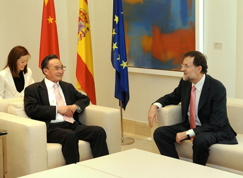 吴邦国积极评价中西关系,对西班牙新一届政府重视发展对华关系表示赞赏。他说,此访是中国全国人大常委会委员长首次访西,目的是同西班牙新一届政府和议会保持高层接触,增进相互了解,探讨新形势下发展传统友好、促进务实合作的新途径,不断充实中西全面战略伙伴关系的内涵。他指出,当前,中西关系正处在历史上最好的时期。良好的政治关系应当促进经贸关系的发展,经贸合作的深化也必将为国家关系发展注入新的活力。特别是在当前全球经济复苏不平衡、欧洲主权债务问题凸显的情况下,中西双方更有必要加强务实合作,以合作抗风险,以合作促发展。一是继续扩大贸易规模和双向投资。充分发挥经贸混委会等合作机制作用,采取积极有效措施,为双方企业加大贸易和投资合作创造条件,鼓励中国企业进口葡萄酒、橄榄油等适销对路的西班牙优势产品,使双边贸易在发展中不断趋向平衡、促进贸易和投资便利化。二是拓展可再生能源等新兴领域合作。中国正致力于调整能源结构,实行鼓励可再生能源发展的政策措施。西班牙新能源应用广泛,管理先进,太阳能、风能开发和有关技术世界领先。双方在这一领域的合作大有可为。中方愿借鉴西班牙可再生能源发电运行管理经验,继续引进西先进技术设备,研究共同实施示范合作项目,促进中国相关产业优化升级。三是加强人文交流。中西都是文明古国,两国人民相互怀有友好感情,都为对方的历史和文化所吸引。希望两国有关部门加大宣传推介力度,创造便利条件,加强文化、教育、体育和旅游合作,使之成为中西合作的新亮点。